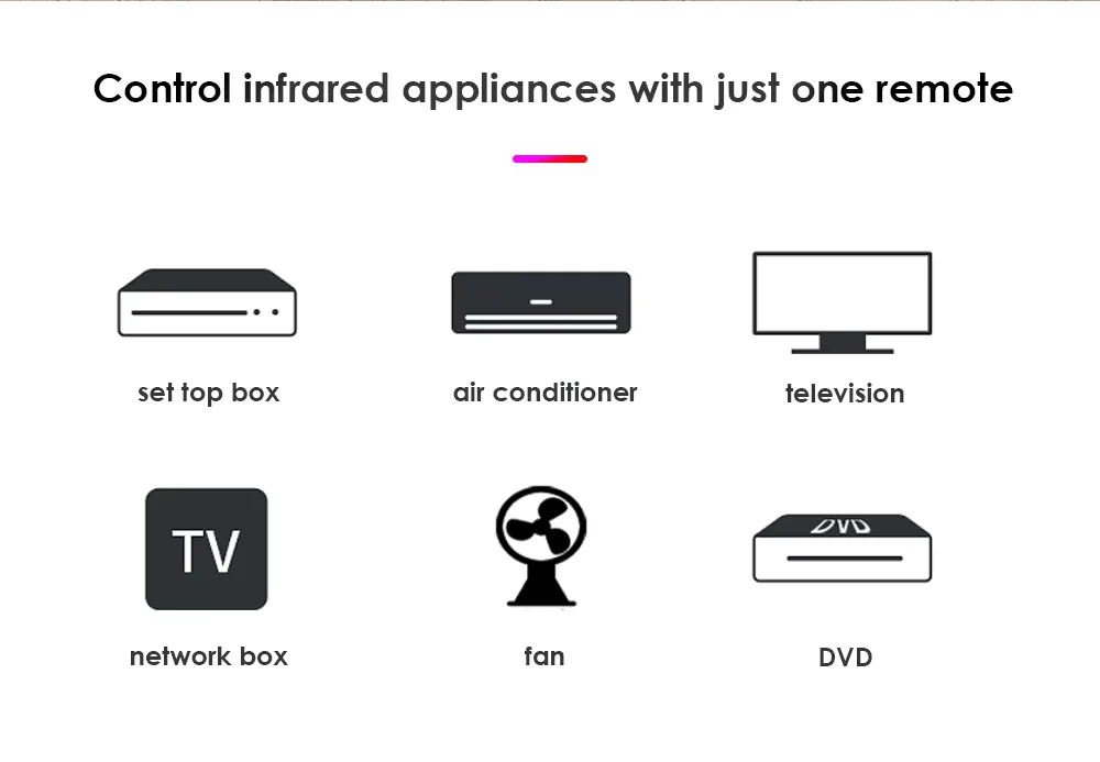 يتحكم بأكثر من 50,000 جهاز يعمل بـ IR (بتردد 38KHz فقط، لا يدعم RF)، مثل المكيفات، التلفزيونات، أجهزة DVD، أجهزة الصوت، الستالايت، وغيرها. -